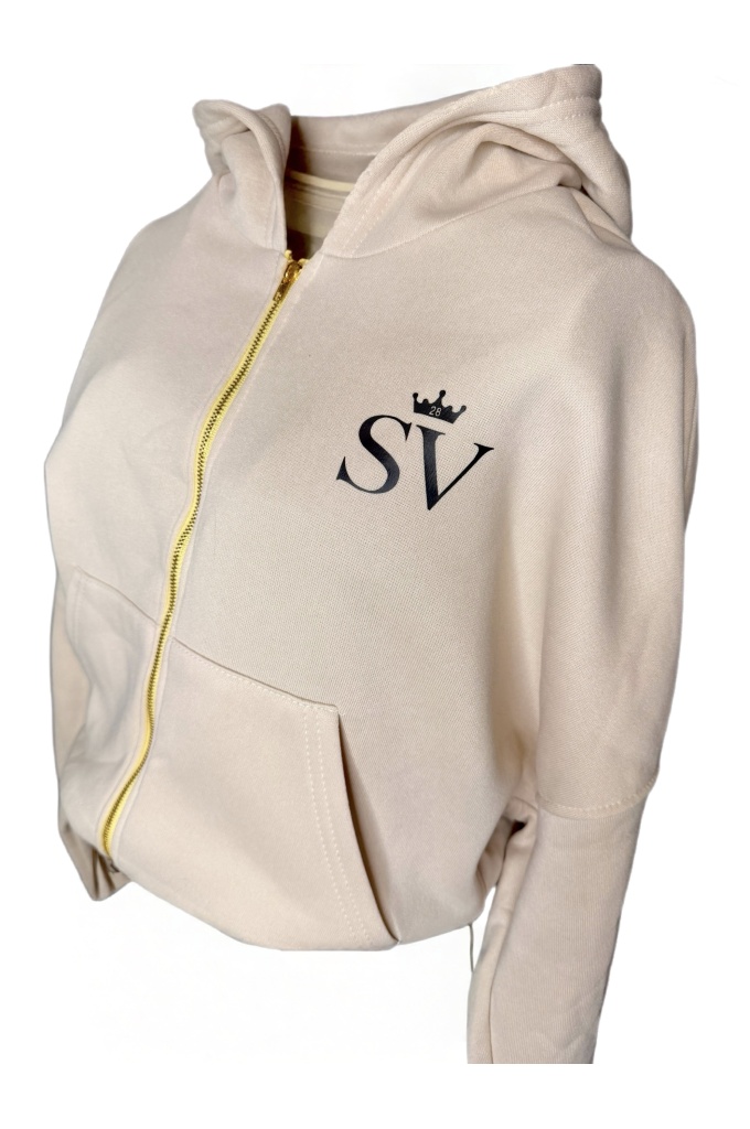 Heledas beežis toonis kapuutsiga lukuga pusa, mille vasakul rinnal on must SV monogramm krooniga. Kuldne täispikk metall-lukk lisab minimalistlikule disainile elegantse ja eristuva detaili.